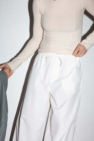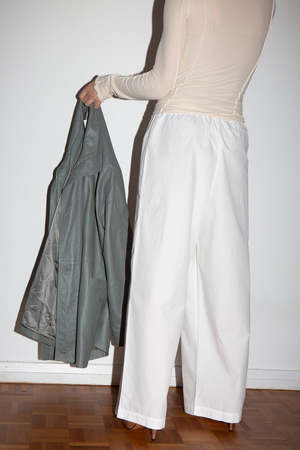 Un-dyed, wide leg, organic cotton poplin pants with a drawstring waistband. 100% organic cotton. Made in Portugal. Model is a UK size 8, is 5.4 ft and wearing a size XS.