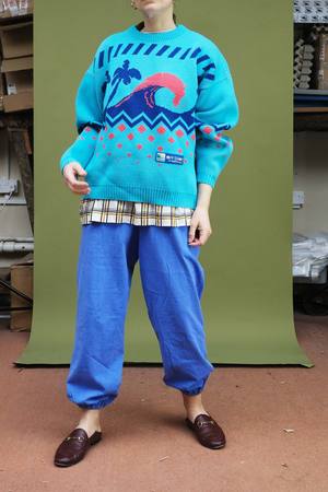 90s vintage snowboard/ski sweatshirt, double knitted wool with wave design Suggested size UK 8-14 Label size: L Chest 48', length 23.5', inside sleeve 20' 50% wool, 18% polyamide, 28% acrylic, 4% other fibres Good condition, slight wear on the cuffs Model wears a UK 8
