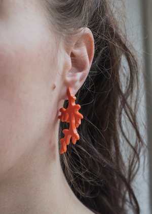 Materials Hand-polished acrylic Coral Hoop earrings in red with sterling silver findings. Measurements 2.25" about Each piece of WOLL Jewelry is made in Elizabeth Woll's San Francisco studio. This line is inspired by mid-century design and early plastics such as bakelite.