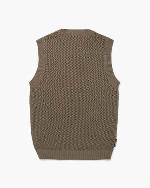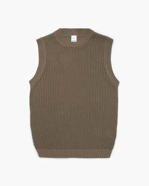 Kaiden Vest in bungee cord brown by Won Hundred. Crafted from 100% organic cotton with an open stitch technique, it boasts ribbed detailing at the neckline, armholes, and bottom hem, making it perfect for both standalone wear and layering. Regular fit.
