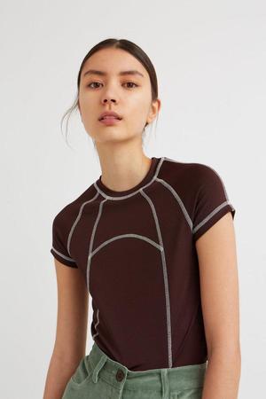 Wood Wood Ingrid T - Shirt - Dark Brown Fit: Stretchy, slim fit Fabric: 90% Polyester / 10% Elastane Features: - The Ingrid sporty T-shirt in Dark Brown is made from a lightweight, stretchy polyester / elastane blend - Contrast flatlock stitching on the front and back - Folded neck rib attached with flatlock stitching - Short sleeves and slim body - Wood Wood print on front side Designed in Copenhagen, Denmark / Made in Turkey
