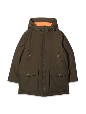 This reversible parka for boys features a shell made from 60% cotton and 40% polyamide, with a fill of 70% recycled grey duck down and 30% feathers. Made in China.
