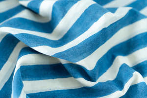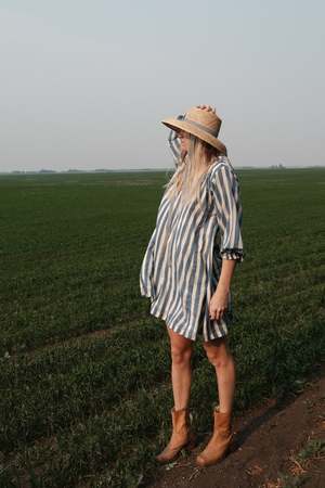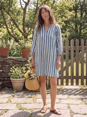 Embrace laid-back sophistication with this charming blue and white striped dress designed in collaboration with Erica and Dee Dee. Featuring a flattering V-neckline, long voluminous balloon sleeves with elasticated cuffs, and a relaxed, flowing silhouette, it offers ultimate comfort and versatile style. Wear it as a standalone dress or layer with a classic Gillette. Crafted over 8 days: 7 days printing, 1 day for making and finishing. - White and Blue - 100% Organic cotton - Hand block print - Azo free dye - Fabric feels soft and light - Ethically made - Each block-printed garment is one-of-a-kind, with slight variations in color and pattern adding to its unique charm. Size & Fit - Falls 36 from the point of shoulder - Fits true to size - Front opening with buttons - Light-weight, non-stretchy fabric. - Model's waist measures " and is wearing a size S for a comfortable fit. For a true-to-size fit, we recommend ordering your usual size. If you prefer a more oversized fit, size up. Meet Mr. Sajid, the maker of this dress.