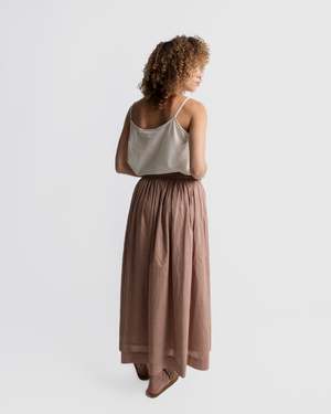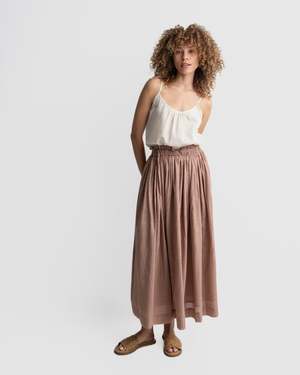 Discover our refreshing garnet pink, designed using fine handwoven cotton. The elasticated waistband ensures a comfortable fit, while the gathers around the waist add a flattering touch. Its flowy hemline elegantly falls at the mid-calf line, making it a versatile piece for summer. Style it with basic t-shirts or strappy tops for a laid-back yet stylish ensemble. Style with Pearl white cotton top - Smocked elasticated waistline. - Voluminous flare. - 36" long - 100% handwoven cotton. - Sustainably made