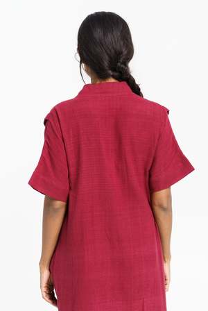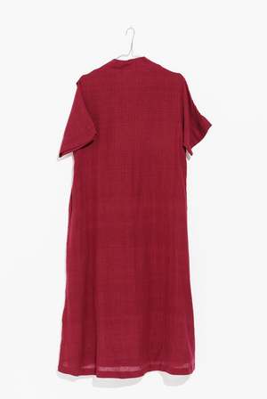 Deep wine is an elegant, summery "work-to-dining" dress that comes in a gorgeous deep wine shade. This fabric is handcrafted from the Kachchh region of India and handwoven by skilled weavers. It's a V-shaped neckline with inverted pleat detail at the front, roomy side pockets, and short sleeves. This style is perfect for day or evening wear. - V neckline - Drop shoulders - Elbow sleeves - Side slits - Relaxed fit - Length: 47 inches - Made with 100% handwoven cotton - "Every style has a different size. Please check the size chart before ordering." - Slightly thick Meet Mr. Safik, the maker of this dress. Badge 2 reviews Widget Customer Reviews Based on 2 reviews Write a review 50% (1) 50% (1) 0% (0) 0% (0) 0% (0) R Rachael Love the color! I really enjoy wearing this dress and this colour makes me very happy and I feel at home wearing this dress... P Pamela Loved it! This is such a dreamy dress. I love wearing it, it great for layering and styling too! Description tag Stay stylish and sustainable with the Deep Wine Organic Cotton Long Dress from World of Crow. Made with organic cotton, this dress is not only environmentally friendly, but also soft and comfortable. The deep wine color adds a sleek and sophisticated touch to any look. With a relaxed fit and a full button front, this dress is perfect for any casual occasion. Pair it with sneakers or sandals for a laid-back look, or dress it up with heels. Available in sizes XS-XL. Shop now at World of Crow. Custom label 1 Dress Rating {"scale_min":"1.0","scale_max":"5.0","value":"4.5"} Rating count 2 Related products [] Related products 3 [] Related products 2 []