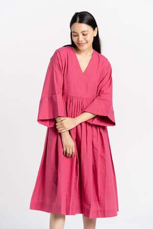 Nothing screams summer more than the vibrant hues of pink flowers. Drawing our inspiration from that, we created this gorgeous midi dress. With a spacious silhouette, an elegant V-shaped neckline, and oversized sleeves with hems that roll up; this dress is stunning in every aspect. To make it even better, the fabric is gathered around the waist for a classy touch. The 100% cotton fabric is weaved by skilled artisans of West Bengal, making it the perfect fit for a dreamy summer picnic. 100% handwoven cotton. Made in India.