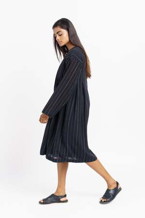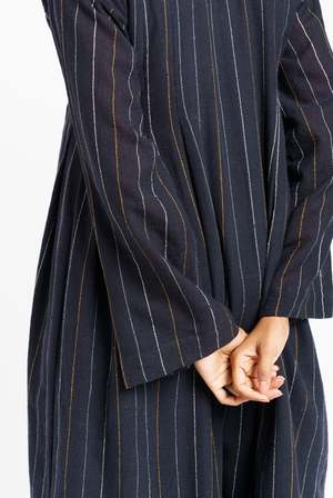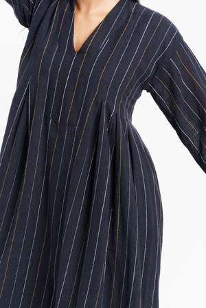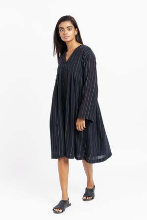 Tailored from textured handwoven cotton utilizing traditional processes to produce a delicate stripe design. This relaxed-fit dress raises the bar for simple versatility & is an adaptable cold-weather staple. It features a sleek V-shaped neckline, long boxy sleeves, and a pleated empire waist. - V-neckline - Full length sleeves - Relaxed fit - Falls 42" from the high point of the shoulder - Lined - Made in organic cotton - Hand wash is recommended - The model is chest 33", wearing size S