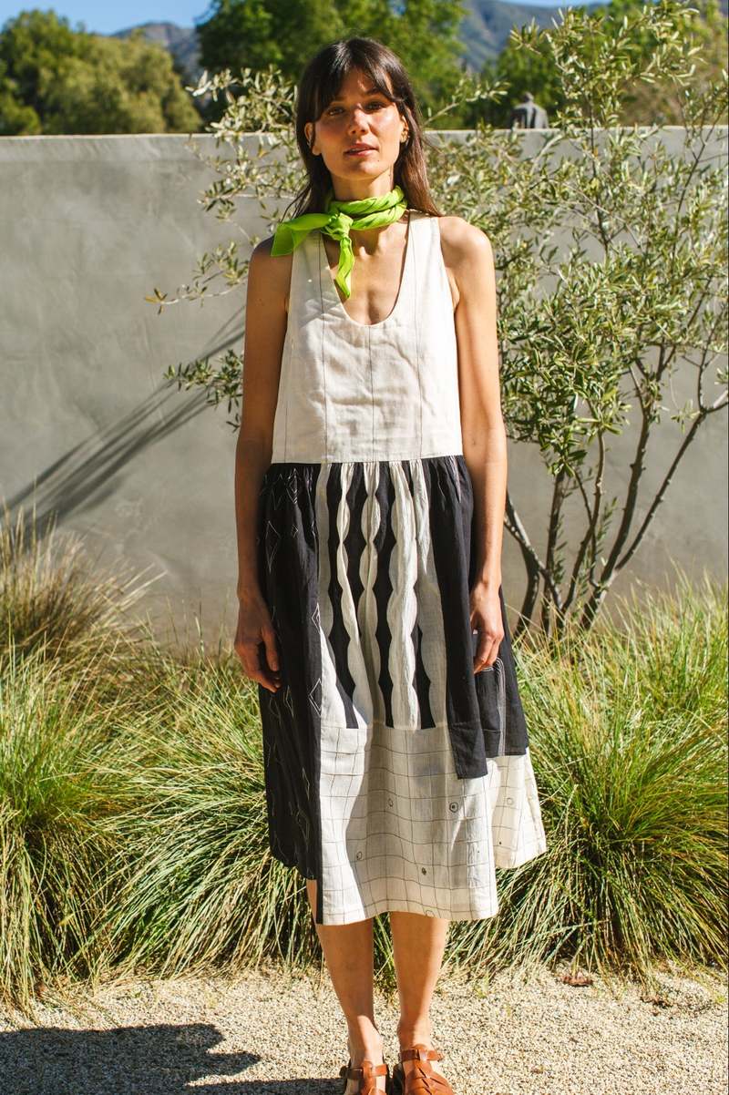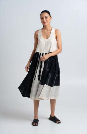 Discover our Joan dress, a pattern filled dress for your everyday wear. The applique and patchwork makes this dress special. Each piece of fabric is made from hand-woven cotton gives the dress rich feel & texture. Layer this up with our Artist Smock and creating a dynamic look for yourself! - Black & white - Hand woven cotton - Applique and patch work - Round V neck - Sleeveless - A-Line - Side pockets - Midi length Size & Fit - Fits true to size - Relaxed fit across the body - Midweight, non-stretchy fabric