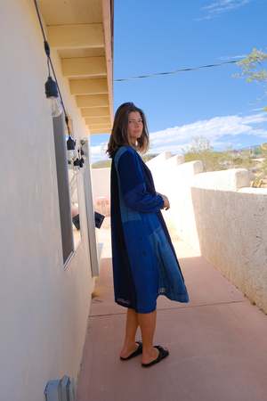 Crafted from a variety of different blue and black Jamdani fabrics, this beautiful dress is a striking blend of artistry and comfort. In rich shades of indigo, this handwoven Jamdani dress features a unique patchwork of checks and subtle woven motifs. The flowy silhouette with gathered sleeves and a soft neckline offers both comfort and elegance, making it perfect for relaxed days or statement evening wear. Crafted over 13 days: 12 days weaving, 1 day for making and finishing. - Shades of blue and black - Oversize fit - Lined and has pockets - Falls 45 from the waist. Size up for an oversized fit. - A 33.5" chest model wears a size S - Handwoven cotton, light, soft, and non-stretchy - Handwoven Jamdani with self checks meticulously woven directly into the fabric All products are ethically made in small batches by local artisans in India. Meet Mr. Salman, the maker of this dress