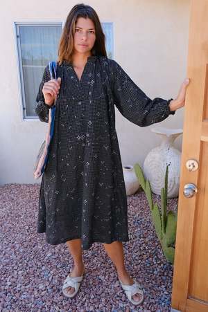This elegant Jamdani dress is a beautiful take on a traditional silhouette. The dress features a high, ruffled neckline with a V-cutout and full, voluminous sleeves. Made from a lightweight, black fabric, it is adorned with a delicate grid pattern and geometric motifs woven throughout. The dress has a relaxed, free-flowing fit that falls gracefully, blending a modern, comfortable style with classic craftsmanship. Crafted over 7 days: 6 days weaving, 1 day for making and finishing. - Black with azo-free dyes. - Oversize fit. - Has pockets. - Falls 45 from the waist. Size up for an oversized fit. - A 33.5" chest model wears a size S. - Handwoven cotton, light, soft, and non-stretchy. - Handwoven Jamdani with self checks meticulously woven directly into the fabric. All products are ethically made in small batches by local artisans in India. Meet Mr. Salman, the maker of this dress.