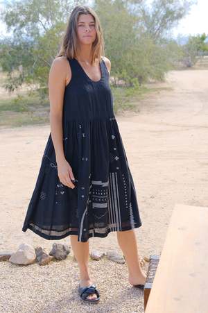 Introducing a new twist to the Jamdani dress, this elegant black piece is a true work of wearable art. The sleeveless silhouette features a subtle scoop neck and a gathered waist. Intricate, handwoven Jamdani motifs in contrasting white are scattered across the skirt, including lines, grids, and shapes for a modern artistic feel. Crafted over 11 days: 10 days weaving, 1 day for making and finishing. Black with azo-free dyes. Relax fit. Lined and has pockets. Falls 45 from the waist. Size up for an oversized fit. A 33.5" chest model wears a size S. Handwoven cotton, light, soft, and non-stretchy. Handwoven Jamdani with self checks meticulously woven directly into the fabric. All products are ethically made in small batches by local artisans in India. Meet Mr. Salman, the maker of this dress.