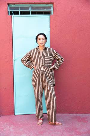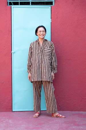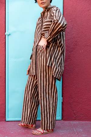This must-have pant is designed in collaboration with Joyce Lee & World of Crow. The wide-leg silhouette and elasticated waistband ensure both comfort and a graceful drape, making them an excellent choice for a relaxed yet refined aesthetic. - Natural & Mocha Brown - 100% Organic cotton - Hand Block print - Azo free dye - Fabric feels soft and light - Sustainably made Each block-printed garment is one-of-a-kind, with slight variations in color and pattern adding to its unique charm. Size & Fit: - Falls 38 from waist - Fits true to size - Fitted at waist falls loose over the hips and legs - Elasticated across the waist for a flexible fit - Light-weight, non-stretchy fabric