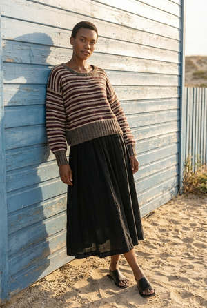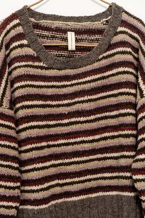 Inspired by mountain dusk, the Nightstripe Sweater is crafted from naturally dyed Himalayan wool in deep charcoal, moss green, lilac, and cream stripes. Hand spun and hand knit by women artisans, each piece carries its own unique texture and character. Natural dye variations create gentle irregularities, giving the sweater its raw, grounded, and softly nubby feel unmistakably handmade. - Hand-spun - Hand-knit - Naturally Dyed (Plant dyes shift with the season, making color irregularities part of its charm) - Indigenous Himalayan Wool - Raw, natural, slightly textured feel.