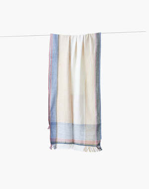 This striking hand-spun and handwoven Maheshwari stole is crafted from pure conventional cotton. It features a sophisticated, multi-panel design. The central off-white body is flanked by distinct vertical panels: one with fine, subtle pinstripes and the other with bold blocks of blue, pink, and grey stripes. The ends of the stole have a wider, checkered pattern in coordinating blues and pinks, and are finished with a delicate fringe. This piece is colored with azo-free vat dyes, ensuring a clean and safe product that combines traditional craftsmanship with a modern aesthetic. - Mix of off-white, blue, pink, and grey - Handspun - Handwoven - Size: 25 x 78.7 inches - Conventional cotton with azo-free vat dye - Dry clean only