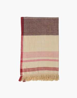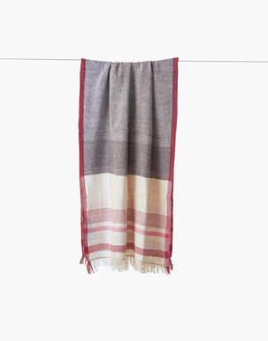 This elegant hand-spun and handwoven Maheshwari stole is crafted from pure conventional cotton. It features a modern, color-block design with a top half in subtle grey and a bottom half in off-white with fine red stripes. A striking dark red border frames the entire piece, and the ends are finished with a delicate fringe. It's colored with AZO-free VAT dyes, ensuring a beautiful, safe, and high-quality product. - Grey, off-white, and dark red - Handspun - Handwoven - Size: 25 x 78.7 inches - Conventional cotton with AZO-free VAT dye - Dry clean only