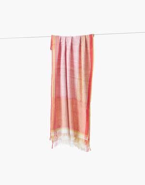 This beautiful hand-spun and handwoven Maheshwari stole is crafted from pure conventional cotton and features a bright, multi-panel design with vertical sections of soft pink and vibrant yellow. The pink section has delicate pinstripes, while the yellow panel has subtle checkered and striped details. The ends are finished with a soft fringe. Made with azo-free vat dyes, this piece is a joyful and high-quality accessory. - Soft pink and vibrant yellow - Handspun - Handwoven - Size: 25 x 78.7 inches - Conventional cotton with azo-free vat dye - Dry clean only