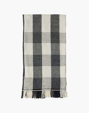 This classic hand-spun and handwoven Maheshwari stole is crafted from pure conventional cotton. It features a timeless black-and-white buffalo check pattern, with a soft, textured feel. The ends are finished with a delicate fringe. This piece is colored with azo-free vat dyes, ensuring a clean and safe product that combines traditional craftsmanship with a modern aesthetic. - Black and white - Handspun - Handwoven - Size: 25 x 78.7 inches - Conventional cotton with azo-free vat dye - Dry clean only