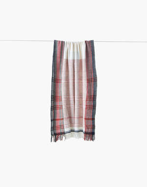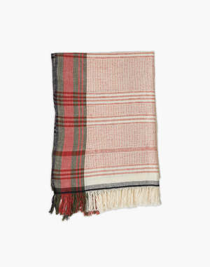 This hand-spun and handwoven Maheshwari stole is a luxurious blend of conventional cotton with a soft and breathable feel. It features a modern design with a subtle plaid pattern in an off-white, grey, and muted reddish-pink palette. The ends are finished with a delicate fringe. This piece is crafted with AZO-free VAT dyes, ensuring both a beautiful finish and a commitment to quality and safety. - Off-white with light grey, and a muted reddish-pink - Handspun - Handwoven - Size: 25 x 78.7 inches - Conventional cotton with Azo free Vat Dye - Dry clean only