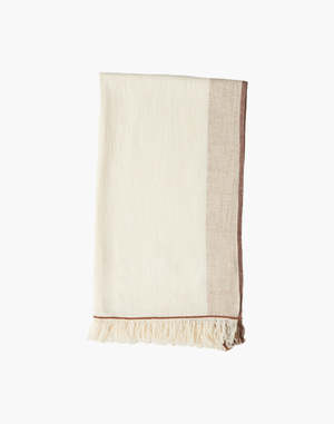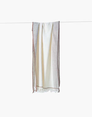 This minimalist hand-spun and handwoven Maheshwari stole is crafted from pure conventional cotton for a soft, breathable feel. Its elegant design features a solid off-white body, bordered by a wide band with a subtle checkered pattern in light beige and brown. The ends are finished with a delicate fringe. Made with AZO-free VAT dyes. - Off-White - Handspun - Handwoven - Size: 25 x 78.7 inches - Conventional cotton with AZO-free VAT dye - Dry clean only
