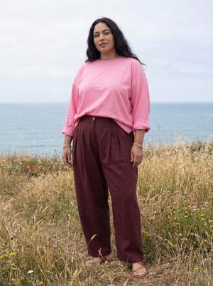 Designed in collaboration with Meredith Peck, these stylish maroon trousers blend comfort with a polished design. They feature a comfortable, elasticized waist at back and deep pleats that create a relaxed, voluminous fit that gracefully tapers at the ankle. Complete with convenient side and back pockets, this piece is perfect for a chic daytime look when paired with a simple tee or tank. Crafted over 2 days: 1 day weaving, 1 day for making and finishing. - Deep wine maroon with azo-free dyes - Relaxed fit with a button and zip closure - Has pockets - Falls 42 from the waist - Size up for an oversized fit - A 29" waist model wears a size S - Handwoven cotton, light, soft, and non-stretchy All products are ethically made in small batches by local artisans in India.