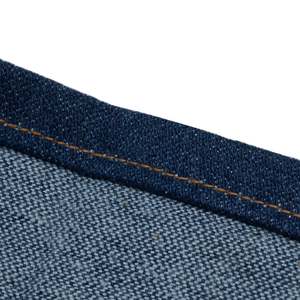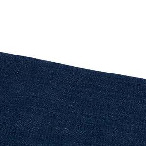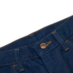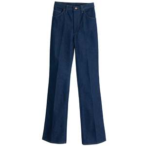 Wrangler Italian bootcut denim, 1970s, in rope-dyed twill, constructed in Malta with high rise, flare leg, goldenrod stitching, and signature W pocketspure utility meets heritage claritys. The vintage Wrangler bootcut trouser exemplifies a convergence of mid-century American workwear engineering, late-1970s Western silhouette trends, and the pragmatic textile innovations that defined Wranglers global expansion strategy. Rooted in the utilitarian ethos that has defined the brand since its 1947 founding by Blue Bell in Greensboro, North Carolina, the garment reflects Wranglers commitment to resilience, mobility, and rugged simplicityqualities originally championed by rodeo legends like Jim Shoulders and exported worldwide during the brands European push in the 1970s and 80s. Constructed in Malta for the European market, the trousers preserve Wranglers core design languagespare, durable, performance-drivenwhile subtly incorporating regional manufacturing precision. The garments high-rise, bootcut silhouette is engineered for both function and expression: its full leg and moderate flare accommodate cowboy boots while conveying the unpretentious strength embedded in American workwear iconography. The patterning eschews decorative complexity in favor of structural claritys. The waistband sits high, drafted with a squared top block and deep crotch rise, indicating a relaxed fit intended for unisex grading or utilitarian wear. The minimal hip curve and shallow, curved front pockets suggest an efficient block with limited dart shapingreinforcing the pieces emphasis on clean linework and manufacturing efficiency. Its dartless seat and absence of yoke paneling yield a flat, uninterrupted rear profilerare for denim, yet consistent with Wranglers functional, hardware-minimalist aesthetic in its non-cowboy casual lines. Panel configuration adheres to the classic five-pocket structure, with the seat formed from a center-back seam and uninterrupted leg line extending into a wide flare. The waistband, self-faced and folded under with double-edge topstitching, reinforces stability without adding unnecessary bulk or material cost. Belt loops are evenly distributed, bar-tacked at each end, and secured cleanly beneath the waistband seam. Construction methodology showcases Wranglers industrial-grade approach: all load-bearing seams are flat-felled for abrasion resistance, with double-needle lockstitching in goldenrod thread providing high-contrast visual delineation and mechanical durability. The fly features a centered brass ECLAIR zipper, bracketed by precision bartacking and a branded metal shank button at the waistband tab. Seam allowances are uniform and clean-finished; fly placket alignment is crisp, minimizing distortion or puckeringhallmarks of high-tension flatbed production using denim-weight machines, likely Union Special or equivalent. The hem treatment consists of a 1-inch double-folded blind hem secured with tonal stitching and executed without seam distortion, evidencing tension-calibrated industrial finishing. Interior pocket bags are cut from dense, white cotton twill, bar-tacked and overlocked, and integrated into the waistband seam for reinforcementrevealing deliberate attention to durability across stress zones. Fabric composition and handling reflect a transitional moment in heritage denim. Constructed from a 65% cotton, 35% polyester twill weave, the fabric presents a tight, dry hand with reduced slub and improved wrinkle resistanceattributes prioritized during the late 1970s90s industrial denim boom. The 3x1 right-hand twill construction is visually confirmed by the diagonal grain slanting , with a rope-dyed warp and open-end spun weft contributing to a clean surface profile and minimized puckering. Though not selvedge, the open-width construction speaks to scalable production. The polyester inclusion, though unorthodox for denim purists, enhances tensile strength and abrasion resistance, making this piece particularly viable for hardwearing applications. Fabric density is likely in the 1113 oz/yd range, consistent with mid-weight workwear standards. The even weave, minimal puckering, and absence of stretch further suggest the use of stabilized, rigid denim processed for shrinkage control pre-assembly. The textiles characteristics place it in alignment with heritage and performance denim from notable mills. Comparably, Kaiharas rope-dyed selvedge shares its weave tightness and indigo saturation, albeit in 100% cotton variants. Cone Mills historical outputsparticularly from White Oakecho the warp tension and twill structure of this garment, though the polyester blend flattens slub contrast. Candianis poly-cotton stretch twills offer a closer parallel in terms of compositional innovation and resilience, while Tavex and Artistic Milliners mirror its workwear orientation through compact twills engineered for structure and durability. Collectively, these mills contextualize the fabric within a lineage of denim development that balances heritage aesthetics with industrial performance. Despite being a woven garment, the evenness of the textile and tight grain lend it a visual solidity akin to heavyweight workwear knits, though without elasticity. Goldenrod topstitching heightens seam visibility while reinforcing structural seamsserving both aesthetic claritys and functional resilience. The absence of rivets, save for the branded shank button and select copper reinforcements on front pockets, underscores a purposeful restraint in hardwarefavoring stitch-based reinforcement over metal fastenings in this utility-driven model. The rear patch pockets are neatly double-stitched, bearing the signature W embroidery formed via high-contrast topstitching, anchored with reinforced back-tacks at all corners. Internal finishing affirms a production sample origin, with a single-stitched yellow Wrangler tab, paper tag, and printed waistband stamp suggesting deadstock status. Seam alignment and clean-finished