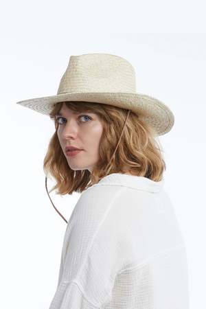 The Lisbon Hat is crafted from 100% straw with a genuine leather stampede strap and offers UPF 50+ sun protection, blocking 98% of UVA and UVB rays. Materials 100% straw Genuine leather strap Care For small stains, use a small amount of diluted mild soap. Dab gently with your fingers, then scrub with a gentle cloth or sponge. Use a damp cloth with warm water to remove the soap. Sizing Brim: 3.25 in Crown: 4.25 in O/S (57 cm) with a velcro size adjuster tucked inside the inner sweatband for a customizable fit.