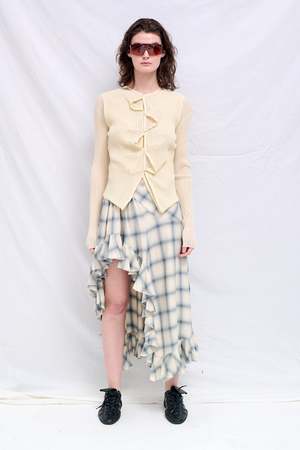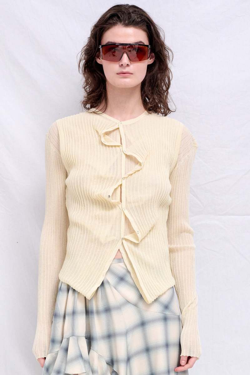 Ivory Double Up Rib Cardigan from Wynn Hamlyn. Constructed as one garment with a double-layered appearance. Adjustable button placements allow for customizable styling. 77% Viscose / 23% Polyester Made in New Zealand.