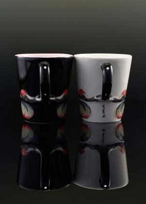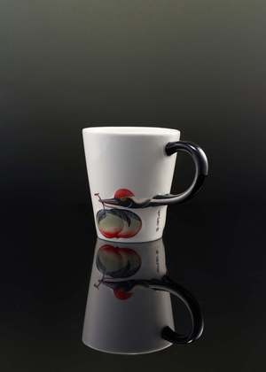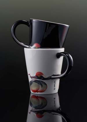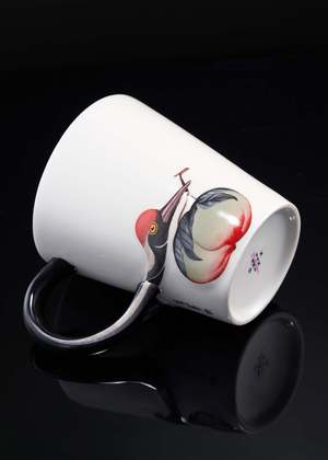 The mug is of a handcrafted porcelain with a wider rim and a glossy glazed finish. The uniform handle of the cup is set in a contrast black, and painted to resemble the curving neck of the crane depicted at its side. A small branded logo2 sits just beneath the handle to complete. Material: porcelain. Dimension: H10cm x D9cm