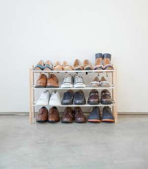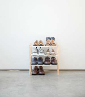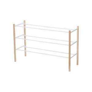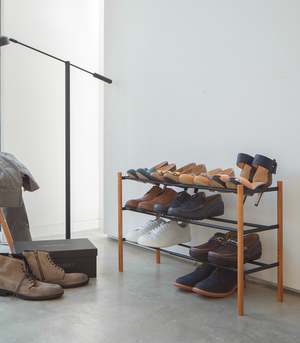 This modern shoe rack combines form and function, offering expandable storage to fit your space requirements. It can store up to 16 pairs of shoes and features a smooth finish. The rack expands from 16.125" up to 27.5" and requires assembly. Dimensions: L 9.84 x W 16.14 x H 17.91 inches.