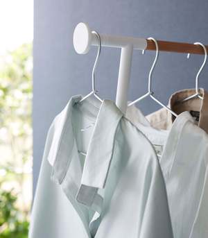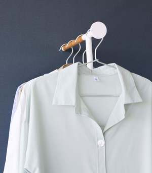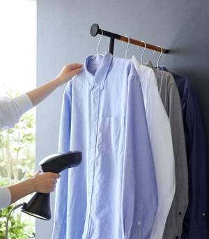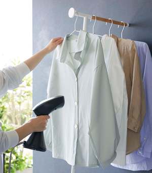 Pressed to impress. Gone are the days of awkwardly trying to steam your shirts as you hang them in the doorway. With the help of this handy leaning hanger, you will get through your steaming queue in minutes. Create a little open wardrobe to supplement your closet space, and use the front hook to hold the item you want to steam. A little wall space is all you need to set up this slim solution, complete with silicone cushions that are gentle on walls and floors.