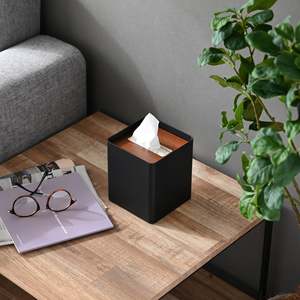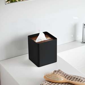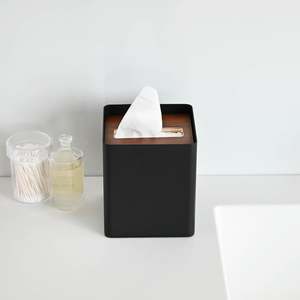 Keep your tissues covered and accessible with this stylish square tissue box cover. Designed to fit standard U.S. square tissue boxes, simply place the box inside and thread the first tissue through the wooden lid. The sturdy steel case and natural woodgrain lid add a modern touch to your decor while keeping tissues in place. The lid was redesigned in October 2022 to feature a wider opening for easier dispensing. Holds tissue boxes up to 5.5" high and up to 48 tissues. Materials: Steel case with plywood lid.