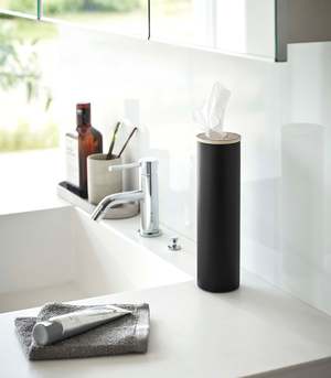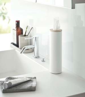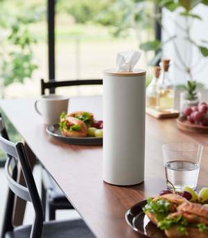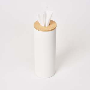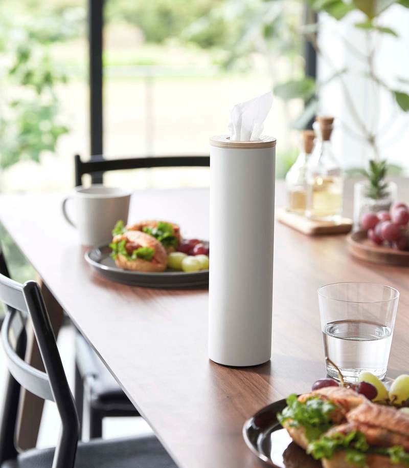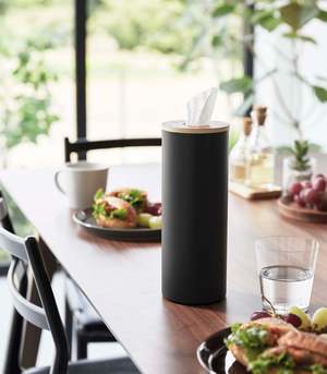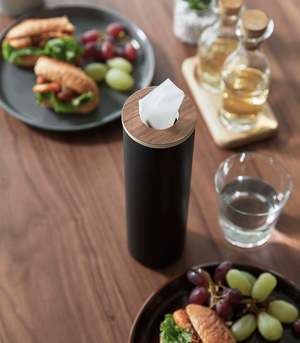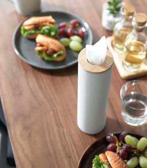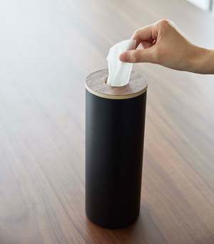 Transform everyday tissues into a luxurious decor item with these slender and modern tissue cases. The sturdy cylindrical steel body provides stability, while the silicone seal lining the wooden top keeps the lid in place for easy dispensing. Simply roll your tissues into a cylinder, insert them from the top, and pull the innermost tissue through the opening. Perfect for coffee tables, sinks, bedside tables, or even car cup holders with the small version.