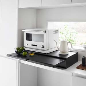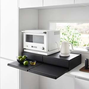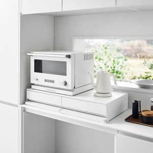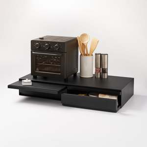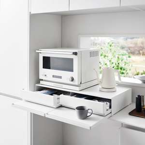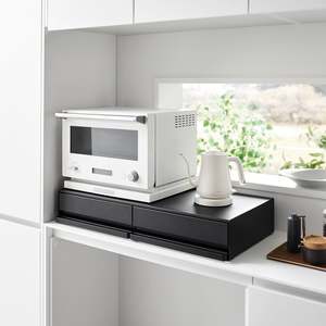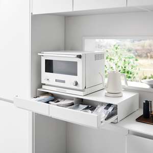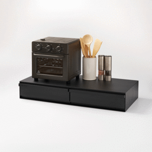 Elevate your kitchen appliances and double your storage. Reclaim precious countertop space with this double two-way drawer. Place larger kitchen items on top and enjoy two extra drawers for utensils, dish towels, pot holders, or tea trinkets. Both sides feature vanishing pull-out shelves, providing ample space to perch a mug while you prepare your morning beverage or rest a bowl of leftovers before serving. The position of the cabinet and shelf can be flipped depending on whether you want the pull-out shelf to be under or above the drawer.