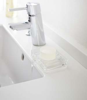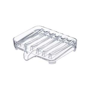 Keep your counters dry and organized with this compact self-draining soap tray. The sloped base suspends your soap or sponge to keep it dry, while water drains through the spout back into the sink. Made from durable acrylic. Dimensions: L 3.94 x W 4.33 x H 0.87 inches. Assembly: None required.