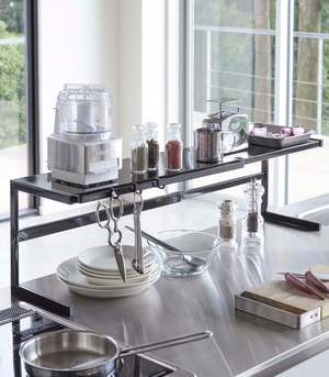 A minimalist, expandable rack designed to transform your countertop storage. This shelf provides additional space for kitchen essentials such as spices, oils, dishes, and accessories. It features a durable steel construction and offers 9 inches of clearance between the counter and the bottom of the shelf. The shelf can hold up to 22 lbs, with each hook supporting approximately 0.6 lbs.