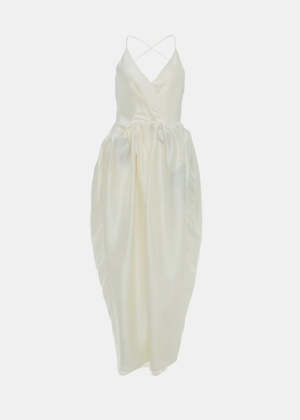 Cross-back gathered silk dress in white. Cross-back straps Gathered skirt Draped bodice 100% Silk Made in China.