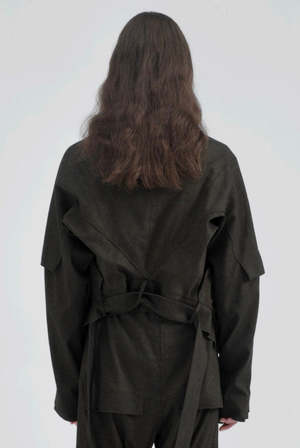 Linen and Silk Jacket with long sleeves, button closure at front, two side pockets, deconstructed design, and asymmetric details throughout. Colour: Green. Composition: Linen Silk. Code: C9000088.