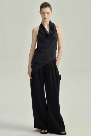 Yehuafan explores the quiet beauty of material and form. Each piece is crafted with a focus on texture, proportion, and the natural character of the fabric, resulting in a raw and refined look. Designed to age gracefully, Yehuafan pieces carry the marks of time and use, becoming more personal with every wear. Yehuafan believes in feminine beauty, using smooth curves to complement the body, and specializes in asymmetrical cutting and deconstructed silhouettes, as seen with the Silk Black Top. Yehuafan top in black. Sleeveless. Soft, fluid fabric. Colour: Black. Composition: Silk.