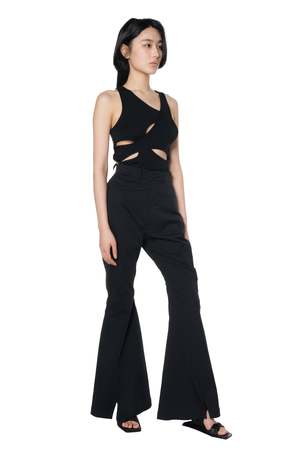 Yehuafan believes in feminine beauty with his own way to explain the smooth curve to compliment womens body. He specialised in asymmetrical cutting and deconstructed silhouette as seen with the Black Flared Trousers. Button closure at waist, Two front pockets. Two back Pockets. Stitching details throughout. Flared leg. Slit at bottom. Colour: Black. Composition: Wool