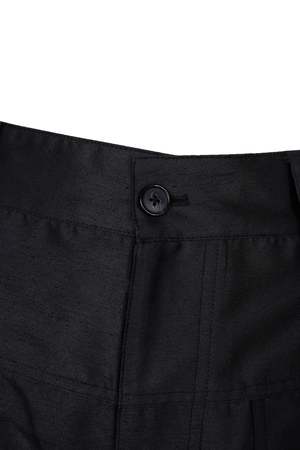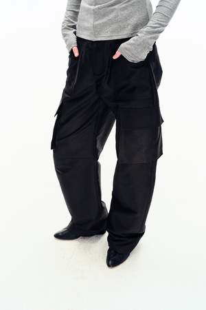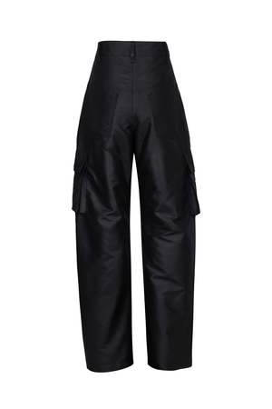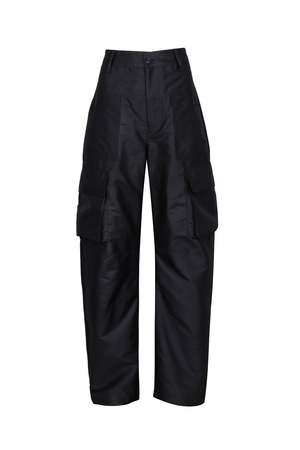 This fabric has a subtle sheen and is super light. These black cargo trousers feature a structured, high-rise silhouette and a relaxed straight-leg fit. Designed with multiple utility pockets and clean panel construction, they offer a modern, functional edge. Finished with a button-and-zip closure and belt loops for versatility. Fabric: 100% Polyester Finish: Smooth satin texture Fit: High-rise, straight-leg Details: Cargo pockets, belt loops, zip fly Care: Machine wash cold or dry clean Model is wearing size M. Height: 176 cm / 5'9" Waist: 64 cm / 25" Hips: 89 cm / 35"