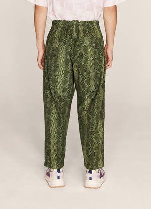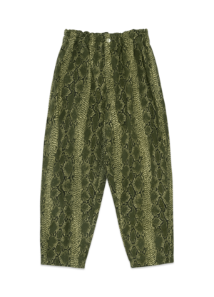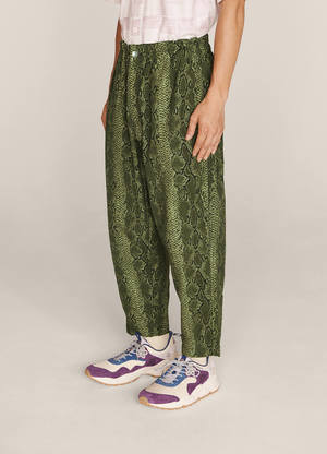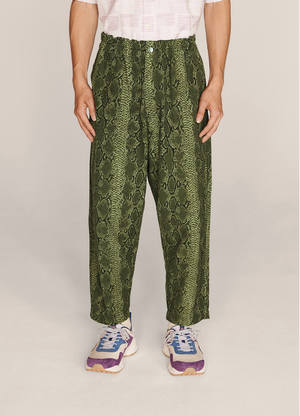 P4SAH30 The Dum Dum trousers are a cropped silhouette, designed in our interpretation of natures camouflage in a all over a detailed snakeskin print fabric. A loose-fitting trouser with a tapered cropped leg. Elasticated waistband creates a ruched waist. Features elasticated waist, and corozo button waist fastening. Seat patch detail with internal back pockets with flaps. Straight side front pockets, Talon zip fly with button fastening bearer, lapped style seam construction and twin needle topstitch. Made in Portugal 100% Cotton Taka's height is 6' and wears size M