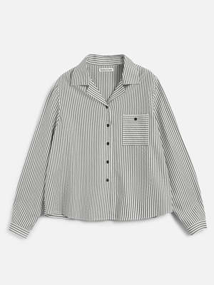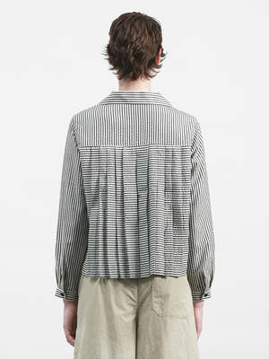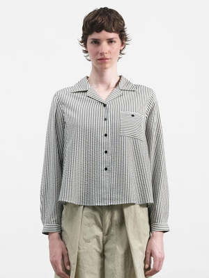 The Annie Pleated Shirt in Stripe from YMC is a cropped long sleeve style, cut from a lightweight Portuguese seersucker with a subtle two-tone ticking stripe. Designed with a relaxed camp collar and a gently structured silhouette. - Cropped long sleeve shirt - Portuguese seersucker with two-tone ticking stripe - Camp collar and chest patch pocket - Pleated back panel for added shape - Corozo button front fastening - Regular fit - 100% Lyocell - Hand wash cold - Made in Portugal