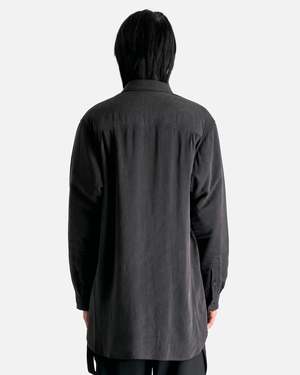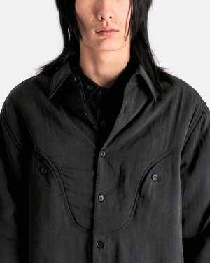 Yohji Yamamoto Pour Homme M-Partially Padded B in Grey. This shirt offers a layered design and features a padded upper body and sleeved portion, front button closure, rounded seam detail on chest, and a round hem. Features include a classic collar, welt chest pockets with button fastening, dropped shoulder seams, pleated buttoned cuffs, and partial lining. Relaxed fit. Model is 6'1" and wears size 03.