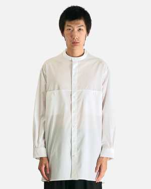 This shirt is crafted from a plain-weave cotton fabric and features a band collar, button front closure, chest pockets at the seam, slits at the hem, straight hem, and chain stitching detail. Relaxed fit. Model is 6'1" and wears size 03. 100% cotton. Made in Japan. Product SKU: HP-B02-001.