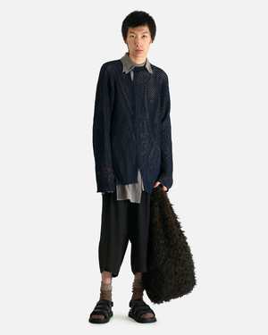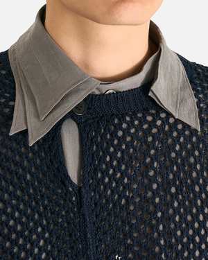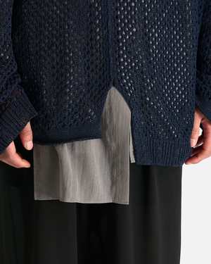 This top is crafted from cotton with a shiny coated yarn and features a ribbed crewneck with single button fastening at the top collar, central seams running down the face and backside, braided trim detail, front and rear vent, and mesh construction. Model is 6'1" and wears size 03. Fabric: 100% Cotton.