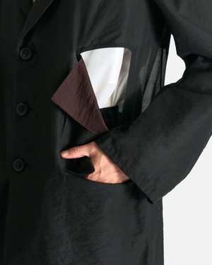 This jacket is crafted from a technical blend of nylon and cupro and features a single-breasted design with a notched lapel, button closure, cut-out details, and a chambray effect throughout. Product SKU: HP-J81-272 Model measurements: - Regular fit - Model is 6'1" and wears size 03 Features: - Single-breasted design - Notched lapel - Button closure - Patch pockets at front - Cut-out details - Chambray effect throughout Fabric/Material: - Main: 51% viscose, 27% polyamide, 22% cupro - Main 2: 70% cellulose, 30% polyamide Made in Japan.