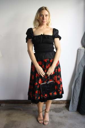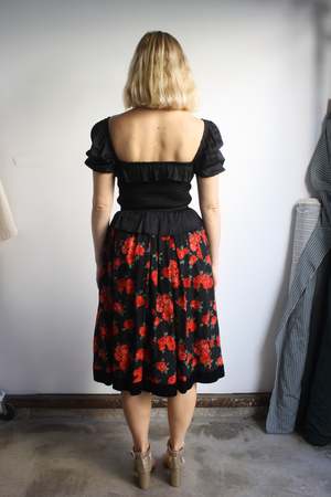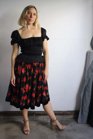 Timeless black floral skirt with rich red roses and a velvet hem. Tagged: Yves Saint Laurent Rive Gauche, Made in France, 100% wool, Size 36. Fits like XS. Measurements: - Waist: 25" (bar closure could likely be moved to 25.5") - Hip: free - Length: 28" Laura is 5'8".