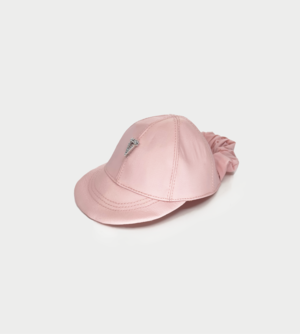 A satin light pink micro baseball cap decor designed with a built-in scrunchie-style hair tie at the back, allowing effortless styling for ponytails or buns. The gathered elastic detail adds volume and flexibility while maintaining a secure, comfortable fit. Vendor Style: 26191PNK00NN. Materials: Brass plated 18k Gold, Polyester. Imported. Type: hair clip.