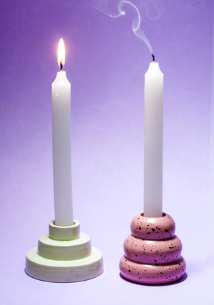 2.5'' x 2.5'' hand painted, hand thrown hollow stoneware candle holders. Bubble style in dark peach speckle glaze and step style in glossy chartreuse glaze. Each piece is wheel thrown by hand and can vary slightly in size and colour from one to the next. Variations are to be embraced by the uniqueness of each piece and the nature of ceramic arts.