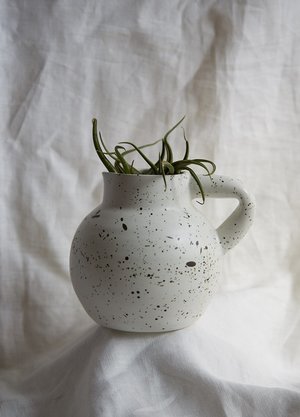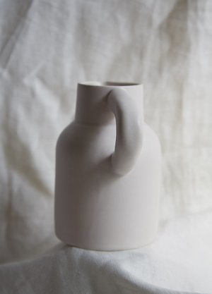 Mrida Anderson is a multi disciplinary queer artist, participating in communities in New York, Montral and Vancouver. Her main focus is on ceramic arts and a background in fashion arts. Mrida presently lives and creates in Montral. Handthrown, handpainted stoneware. Use this jug as a decorative art piece, vase, or pitcher. White glaze with speckles or satin white. 22 oz jug approx. 7 inches high Handmade in Montral